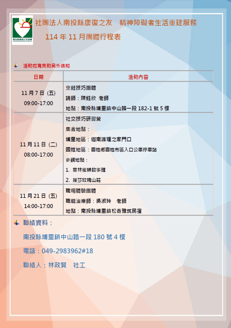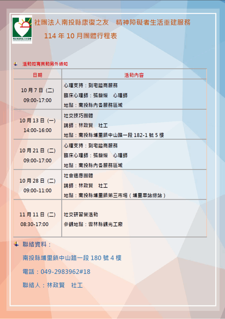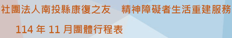 關於我們 本會以加強精神障礙者之家屬團結合作為宗旨,爭取改善醫療與復健服務,以保障精神障礙者之權利與福利。 查看更多 NEWS 最新消息 更多消息 生活重建活動公告 各位朋友好 原本預定11月21日(五)下午2點至5點的活動,職場體驗團體因講師時間配合調整至11月2 繼續閱讀 » 2025-11-21 114年11月份生活重建團體活動表 各位朋友你們好,11月份團體活動行程表已出爐摟,如有興趣參加者歡迎 繼續閱讀 » 2025-10-23 114年10月份生活重建服務團體表 精神障礙生活重建服務10月份團體活動表已出爐,歡迎有興趣參加者踴躍參與,若團體時間變動將另行通知 繼續閱讀 » 2025-10-16 更多消息 SERVICES 服務項目 竹夢會所 – 精神障礙者協作模式服務據點精神病友 查看服務 » 新支助居家長照機構 查看服務 » 精神病人社區居住方案 查看服務 » 長照與身障家照據點共融試辦計畫 查看服務 » 社區整合型服務中心(A單位)服務介紹 查看服務 » 長照交通車服務方案 查看服務 » 114年度厚植精神病友及家屬團體量能計畫 查看服務 » 自由會所 – 精神障礙者協作模式服務據點精神病友 查看服務 » 查看所有服務 Result 114年度1-4月服務成果 身心障礙者個案服務 人次 0 長照服務 人次 0 實物援助 人次 0 家庭照顧者支持服務 人次 0 社區團體活動 場次 0 社區團體參與計畫 人次 0 愛心捐款 我們努力為精神康復者提供優質環境、為身障者提供多元服務方案、為長照使用者提供專業服務。 立即行動