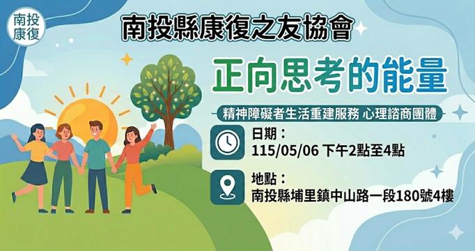 關於我們 本會以加強身心障礙者之家屬團結合作為宗旨,爭取改善醫療與復健服務,以保障精神障礙者之權利與福利。 查看更多 NEWS 最新消息 更多消息 115年5月烹飪技巧團體:墨魚麵的魅力 各位身障朋友好,這裡是精神障礙生活重建服務,本次團體主題是讓學員學習烹煮"墨魚麵",並且由專業講師指 繼續閱讀 » 2026-04-21 115年4月職場體驗團體:面試面面俱到 各位身障朋友們好 生活重建服務於4月30日下午2點舉辦職場體驗活動,對於找工作求職、面試或寫履歷處處 繼續閱讀 » 2026-04-09 115年4月社會適應團體:別讓錢錢偷偷溜走 各位身障朋友們好 生活重建服務於115年4月29日的下午2點舉辦社會適應團體,您是否有個困擾在於身上 繼續閱讀 » 2026-04-09 更多消息 SERVICES 服務項目 南投縣庇護清潔工作隊 查看服務 » 竹夢會所 – 精神障礙者協作模式服務據點精神病友 查看服務 » 新支助居家長照機構 查看服務 » 精神病人社區居住方案 查看服務 » 長照與身障家照據點共融試辦計畫 查看服務 » 社區整合型服務中心(A單位)服務介紹 查看服務 » 長照交通車服務方案 查看服務 » 114年度厚植精神病友及家屬團體量能計畫 查看服務 » 查看所有服務 Result 114年度1-4月服務成果 身心障礙者個案服務 人次 0 長照服務 人次 0 實物援助 人次 0 家庭照顧者支持服務 人次 0 社區團體活動 場次 0 社區團體參與計畫 人次 0 愛心捐款 我們努力為精神康復者提供優質環境、為身障者提供多元服務方案、為長照使用者提供專業服務。 立即行動
