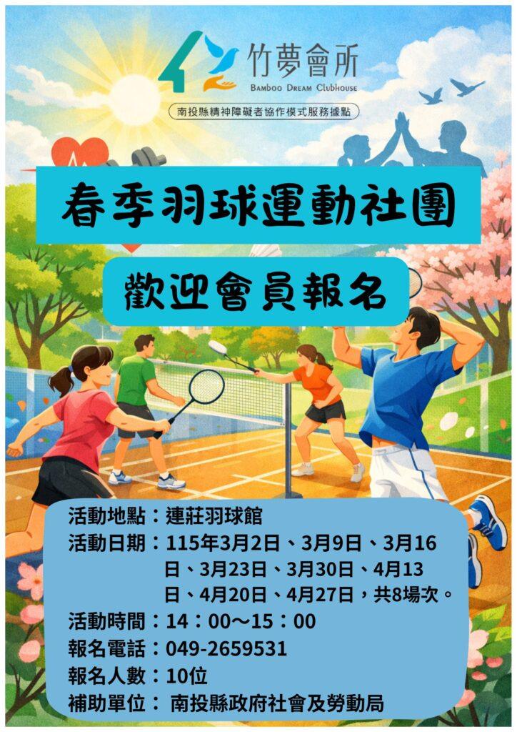 位於竹山的竹夢會所在三月份新增春季羽球運動社團 –