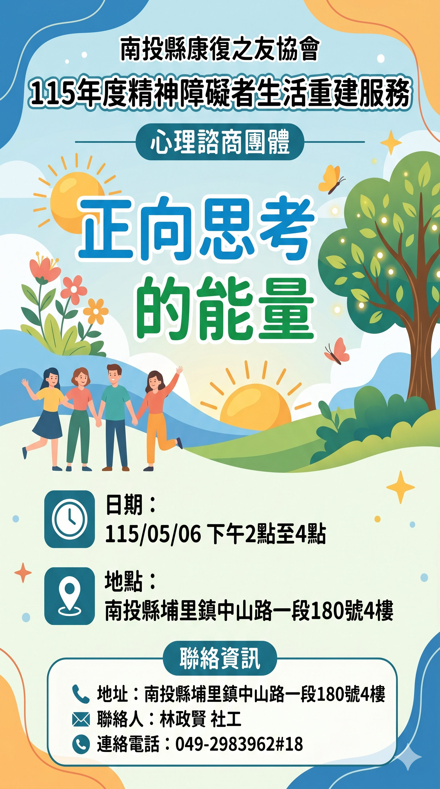 今年生活重建服務的心理諮商團體開始辦理瞜,您是否在生活當中總是遇到一些困境,甚至有些時候腦袋總是會有負面的情緒困擾著你,讓自己很難正向的為自己人生目標進行規劃?本次團體期望藉由正向思考的價值觀,避免讓自己過度陷入於負面思考當中,由專業的臨床心理師進行活動,歡迎有興趣的成員參加